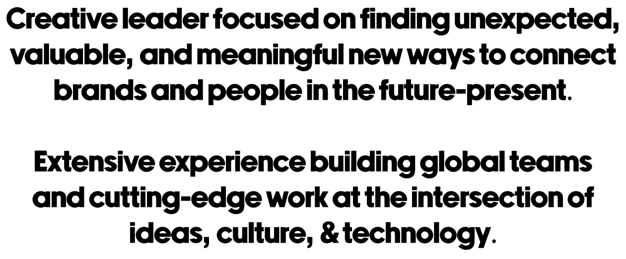 Most recently, I spent a thrilling 12 years at Meta’s Creative Shop leading the in-house innovation teams. During this time I developed several new functions that unlocked new creative capabilities and accelerated breakthrough work for 100’s of brands around the world.